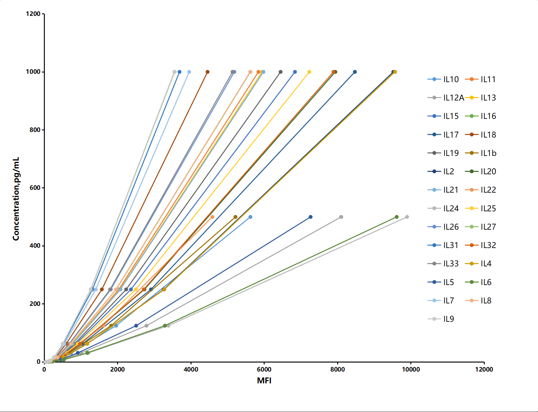当社は、マルチプレックス検出技術の性能を検証するため、主要な2つの商用プラットフォーム(Luminex xMAPシステムおよび流式細胞計CBAシステム)において、複数サイトカインの同時検出試験を実施しました。
