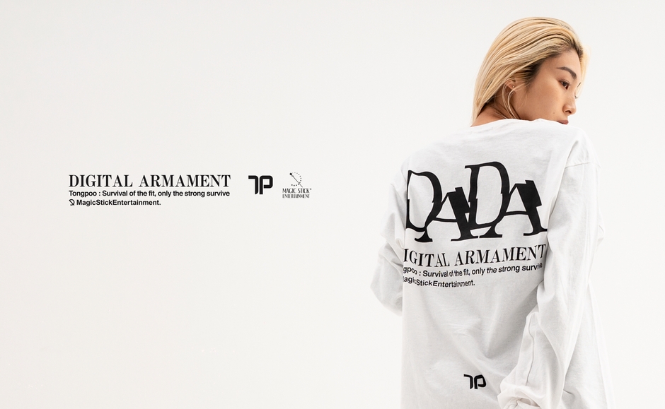 Tongpoo store.で展開するオリジナルアパレルのファーストコレクションのコンセプト“DIGITAL ARMAMENT(デジタル武装)”をテーマにMAGIC STICKデザイナー/ディレクター今野氏がオリジナルグラフィックを制作。「DA」という象徴的なグラッフィックでメッセージの強さを表現しています。