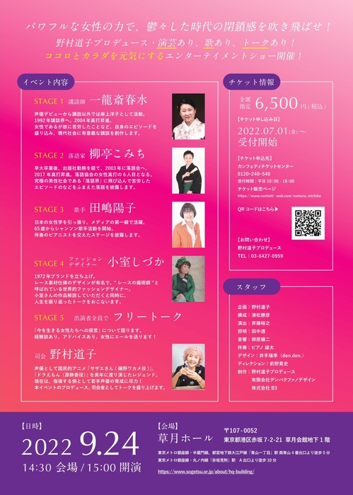 『野村道子プロデュース 芳しき女たち』が022年9月24日 (土)に草月ホール(東京都港区赤坂7-2-21草月会館内(B1階))にて開催されます。