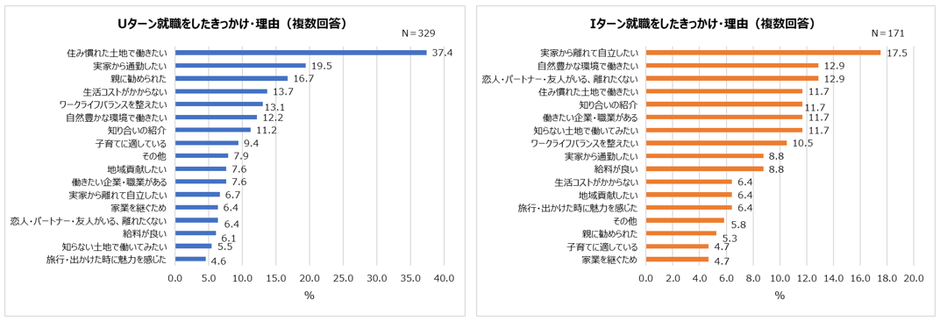 U/Iターン就職のきっかけ Uターン「住み慣れた土地で働きたい」Iターン「実家から離れて自立したい」