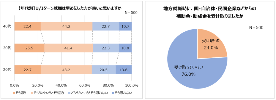 満足度の高かった地方就職ですが、地方就職時は転居や新生活の準備に何かとお金がかかるもの。そこで、国・自治体・民間企業などからの補助金・助成金を受け取った人がどれくらいいるのか調査しました。その結果、約4人に1人が「受け取った(24.0%)」と回答。Uターンは26.1%、Iターンは19.9%が補助金・助成金を受け取っていることが明らかになりました。