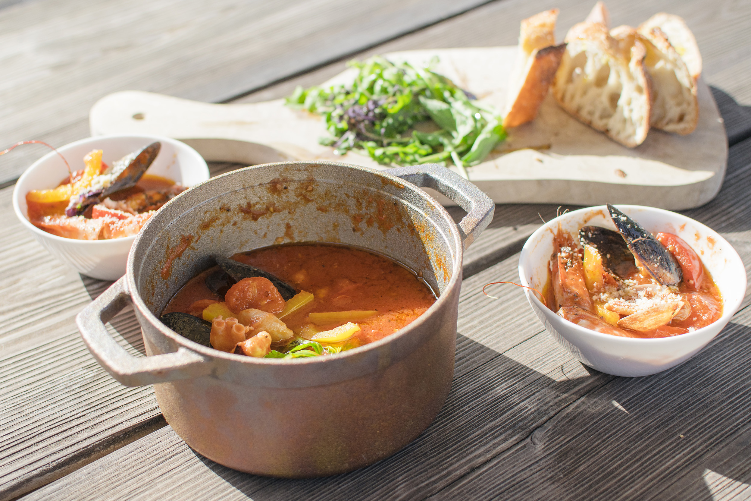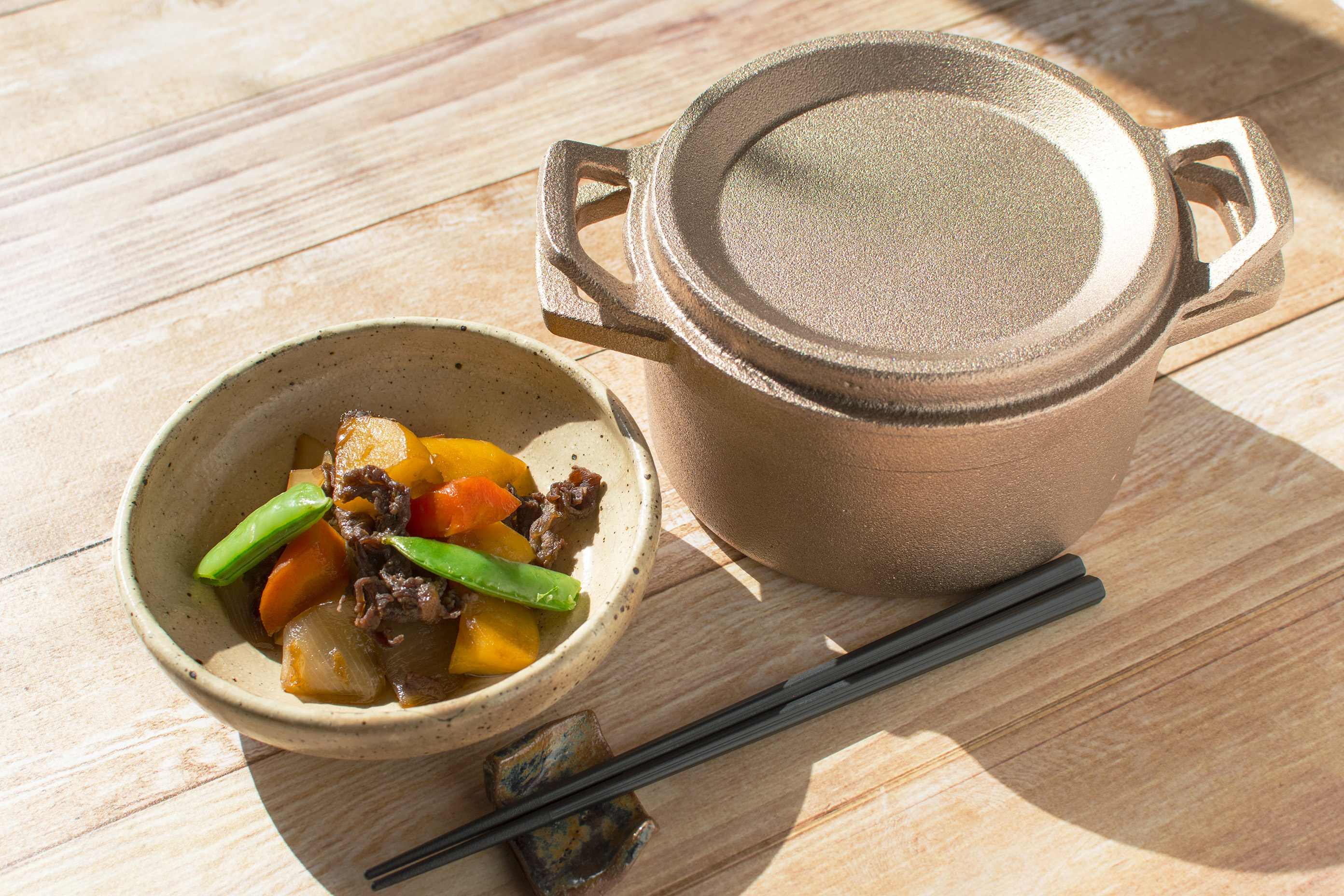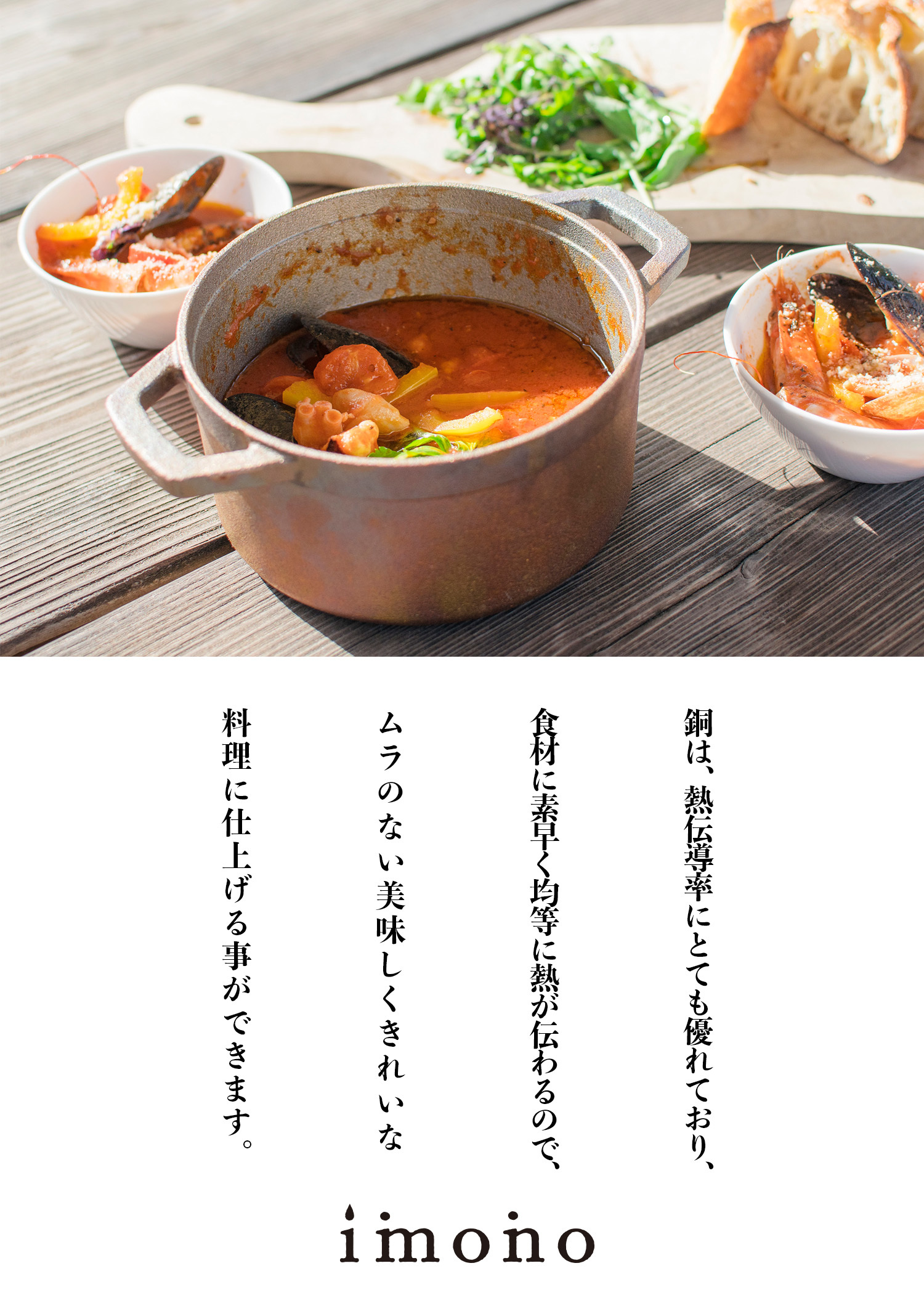 - 銅の熱伝導の良さと、鋳物の特性である蓄熱性の高さを併せ持つことで食材の旨味を引き出します。