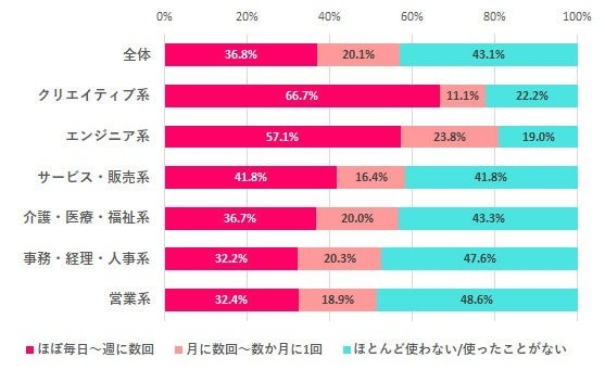 職種別で比較すると、クリエイティブ系は「ほぼ毎日~週に数回」が66.7%で、最も多い回答でした。また、「ほぼ毎日~週に数回」「月に数回~数か月に1回」と回答した人の合計は、1位エンジニア系80.9%、2位クリエイティブ系77.8%と、この2つの職種はおよそ8割の人が生成AIを日常的に使っていることがわかりました。