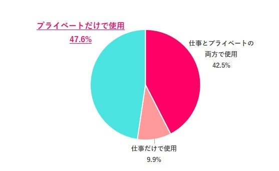生成AIを仕事とプライベート、どちらで使用するかを尋ねたところ、「プライベートだけで使用」が47.6%、次いで「仕事とプライベートの両方で使用」が42.5%でした。「仕事だけで使用」は9.9%と少なく、生成AIはプライベートで多く使われていることがわかりました。
