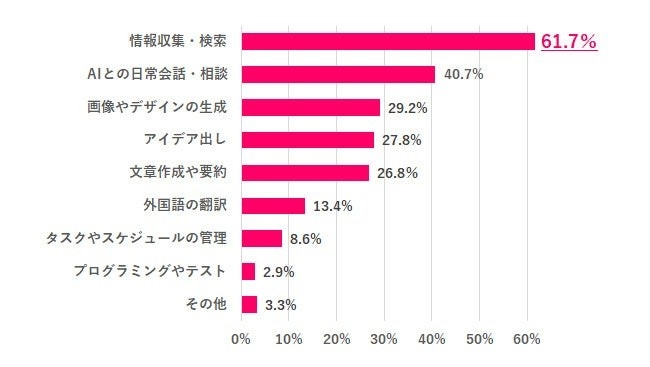 プライベートではどんな場面で、生成AIを活用しているか聞いたところ、1位「情報収集・検索」61.7%、2位「AIとの日常会話・相談」40.7%、3位「画像やデザインの生成」29.2%でした。