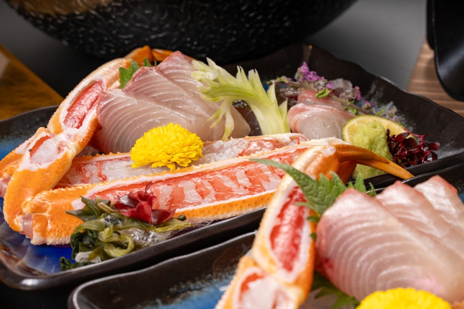 1人につきズワイガニ2杯分を使い、姿盛りから雑炊まで食べ尽くす「カニコース」。または、兵庫県のブランド牛「但馬牛」のすき焼きに出石蕎麦や天ぷらなどが揃うすき焼きコースの2種から選択できます。