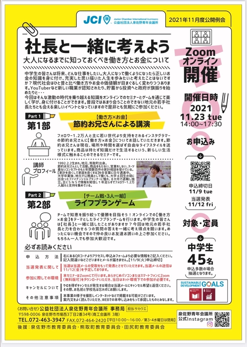 社長と一緒考えよう!泉佐野青年会議所が地元中学生向け “大人になるまでに知っておくべき働き方とお金について” 学べるセミナーをZoomにて11月23日(火祝)に開催