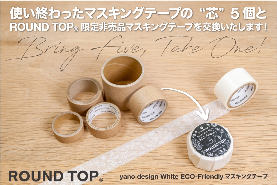 2020年11月27日(金)~2020年11月29日(日)までの3日間、「文具女子博2020」ご来場時に「ROUND TOP」ブースへマスキングテープの使用済み紙管を5個お持ちいただきますと、ROUND TOP限定非売品の「yano design White ECO-Friendlyマスキングテープ」1つと交換させていただきます。会場にて回収いたしました紙管は再生紙へ生まれ変わります。