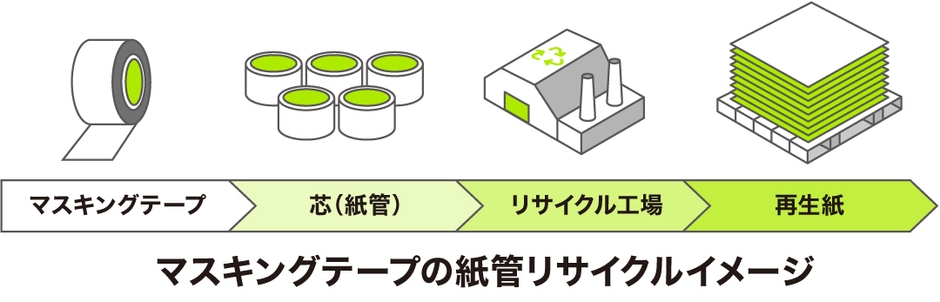 いつも皆様にお使いいただいているマスキングテープの芯(紙管)は、そのまま捨てられるとただのゴミとなりますが、実は再生紙としてリサイクル可能です。丸天産業ではリサイクル活動の小さな第一歩といたしまして、廃材を再利用することにより廃棄物を削減できることを広くアピールし、持続可能な社会の実現に向けた取り組みを行ってまいります。