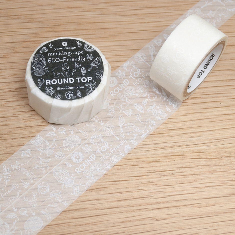 ROUND TOP限定非売品「yano design White ECO-Friendlyマスキングテープ」を手がけたのは、岡山の矢野デザイン事務所。サステイナブルな自然をテーマに、さまざまな動物や植物が共生する風景を和紙テープに白インクで印刷した「ホワイトマスキングテープ」で表現。シンプルながら変化に富んだかわいいデザインに仕上がっております。また、通常はプラスチックが使用されるテープの包材にも和紙を採用し、手触りの良さや心地よさを実現するとともに、プラスチックゴミの削減にも配慮したパッケージとなっています。