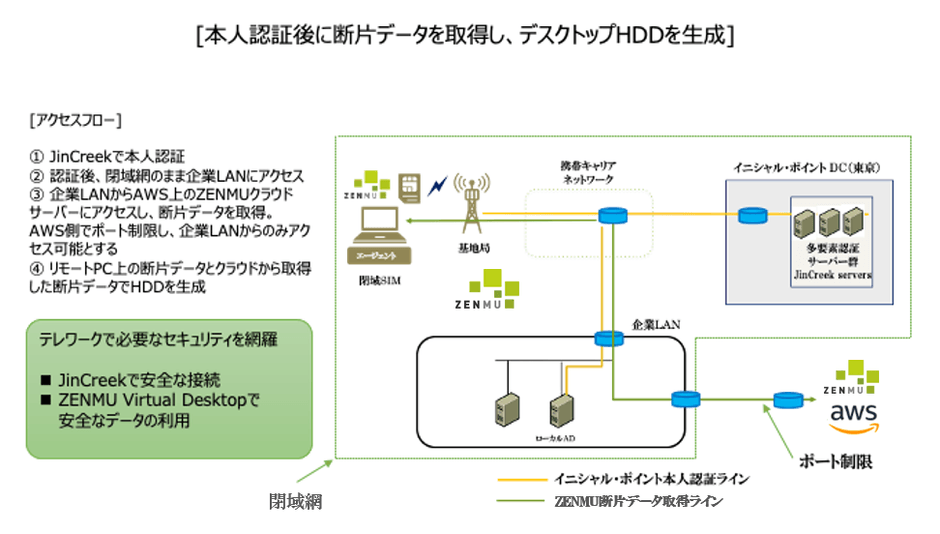 本人認証の精度を高める「多要素認証サービス(商品名:JinCreek)を提供するイニシャル・ポイント株式会社(本社:東京都新宿区、代表取締役:嶋村 俊彦、以下 イニシャル・ポイント)と秘密分散によるパソコンのデータ保護製品「ZENMU Virtual Desktop」を提供する株式会社ZenmuTech(本社:東京都中央区銀座、代表取締役:岡積 正夫、以下 ZenmuTech)は、両社のソリューションを組み合わせ、本人認証後に秘密分散された断片データを取得し、パソコンの中のデータを生成する、最高水準のセキュリティでのリモートワーク環境の提供を2020年11月20日より開始します。