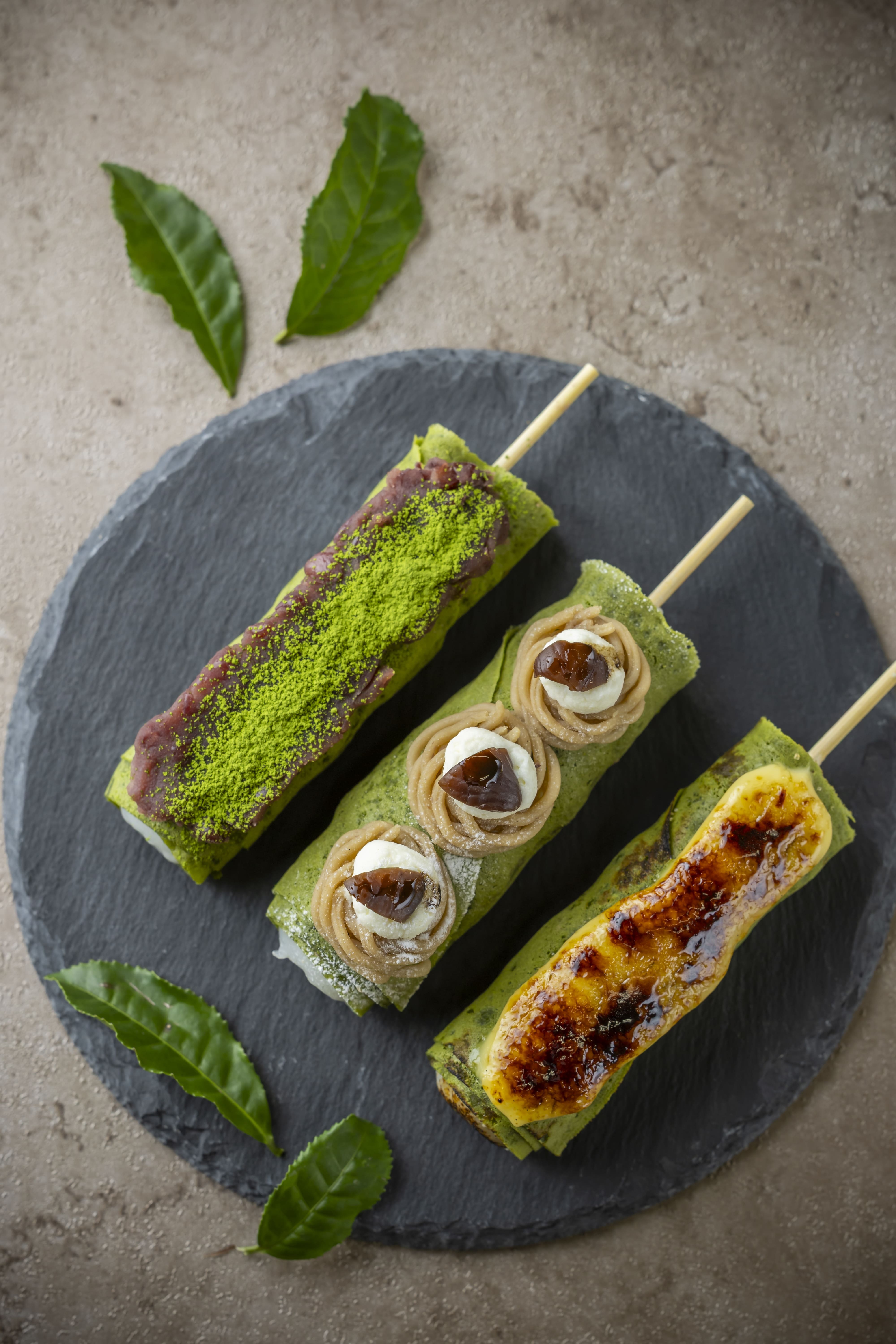 もちもちのおだんごを、栗・栗あん・抹茶ソースをトッピングしたお濃茶クレープ生地でくるりと包み、モンブランをまるく絞って仕上げました。