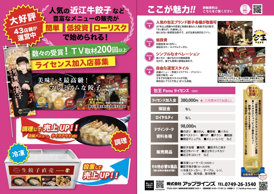 【各都道府県1店限定】販売代理店(モニター店)を募集開始! 数々の受賞と実績!創業22年の餃子専門店「包王paou」