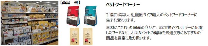 今回の改装では、おうち時間の増加からニーズが高まっている冷凍食品・ワイン・ペットフードの売り場を近畿圏ライフ最大級の品ぞろえにリニューアルいたします。また、ライフ旗艦店で人気の商品や志紀店から先行発売する商品も含めて、1,000種類以上の新商品が登場いたします。