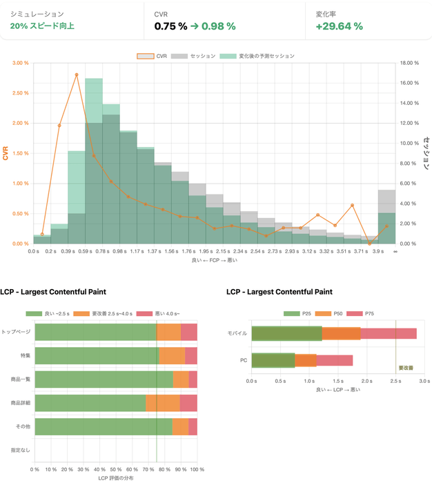 Speed is Moneyをお使いいただくと、ユーザーごとの体験スピードがPV数や成約率(CVR)にどのように影響するかを分析し、高速化によって得られる収益を事前に見積もることが可能です。これにより、企業によるサイトスピード高速化の意思決定を促します。