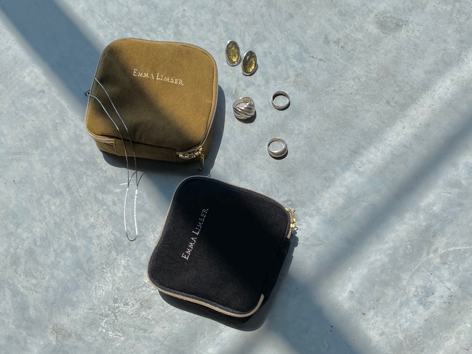 裏地にはデビューコレクションでの人気アイテム、ヘリンボーンチェスターコートの裏地に使用したペイズリー生地を使い、EMMA LIMBERの刺繍を入れております。持ち運びにも便利なコンパクトなサイズ感で、シーンによってアクセサリーを変えたい時にも便利です。