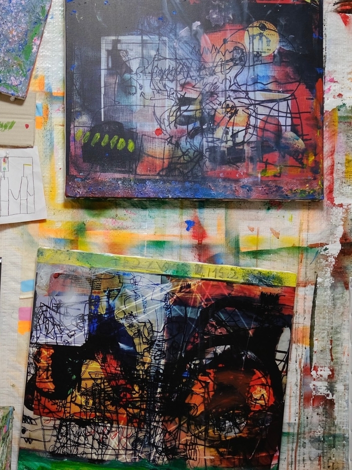 しかし一歩部屋に足を踏み入れると、生活感なんてまるでなかった。それはそうだ、何せアトリエだしね。2DKの2室共にキャンバスが並び、無造作(のように見える)に置かれた画材と作品と大きなスピーカー。