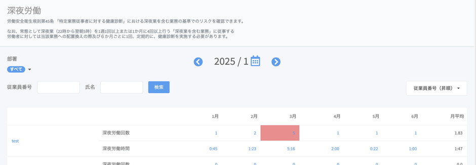 本機能では、こちらの健康診断実施の義務違反を防ぐため、管理者・承認者は管理画面で任意の開始月から6ヶ月間の月の深夜労働の回数と時間数を確認し、受診対象者を可視化することが可能です。