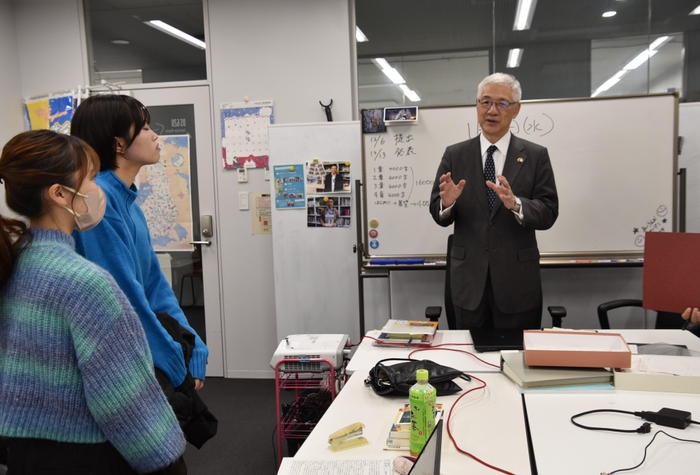 在リトアニア日本国大使館の尾崎哲・特命全権大使が12月20日、本学ナゴヤドーム前キャンパスを訪れ、ロシアのウクライナ侵攻でリトアニアに逃れた避難民を支援する「杉原千畝ウクライナ難民募金」の代表を務める都市情報学部の稲葉千晴教授や募金活動に取り組んだ稲葉ゼミの学生と懇談しました。寄付金の贈り先を紹介して仲介の労を取った尾崎大使は、避難民の子どもたちにクリスマスプレゼントが贈られたことや難民募金への協力に対する感謝の言葉を伝えました。