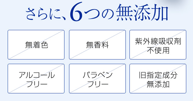 また、お肌に優しい処方で、「パラベン・アルコール・合成香料・合成着色料・旧指定成分・紫外線吸収剤」フリー処方で、安心して使用していただけます。