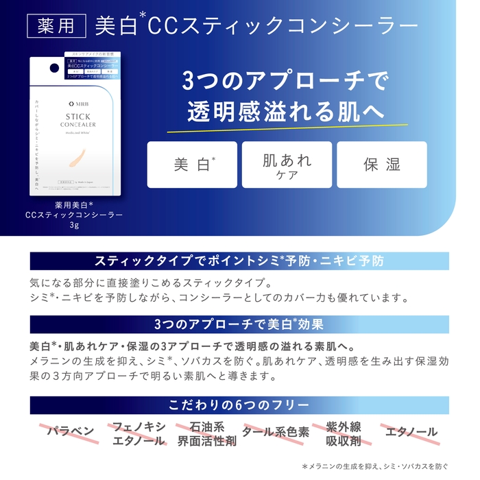 シミ予防・ニキビ予防に特化した多機能 薬用美白スティックコンシーラー。コンシーラーでありながら、美白とニキビ予防としての役割を果たす新しい概念のコンシーラーです。