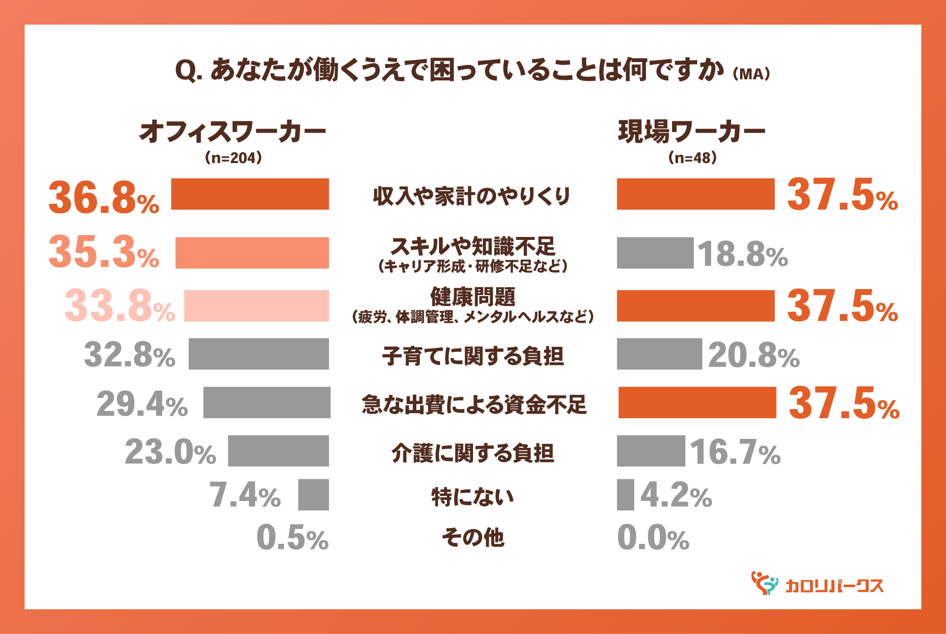 オフィスワーカーでは、「スキル・知識不足(キャリア形成)」が高く、自己成長やキャリアアップに関する不安がうかがえます。一方で現場ワーカーでは、収入や家計のやりくりと同率で「急な出費への備え」「健康問題」が高く、より“日々の暮らしの足元に直結する不安”が強く表れる結果となりました。