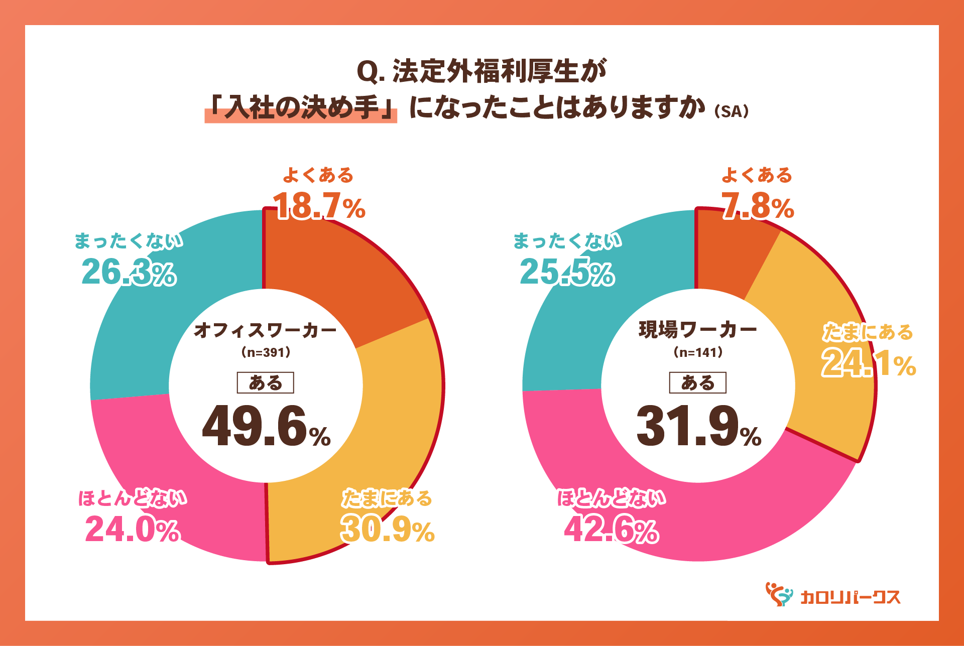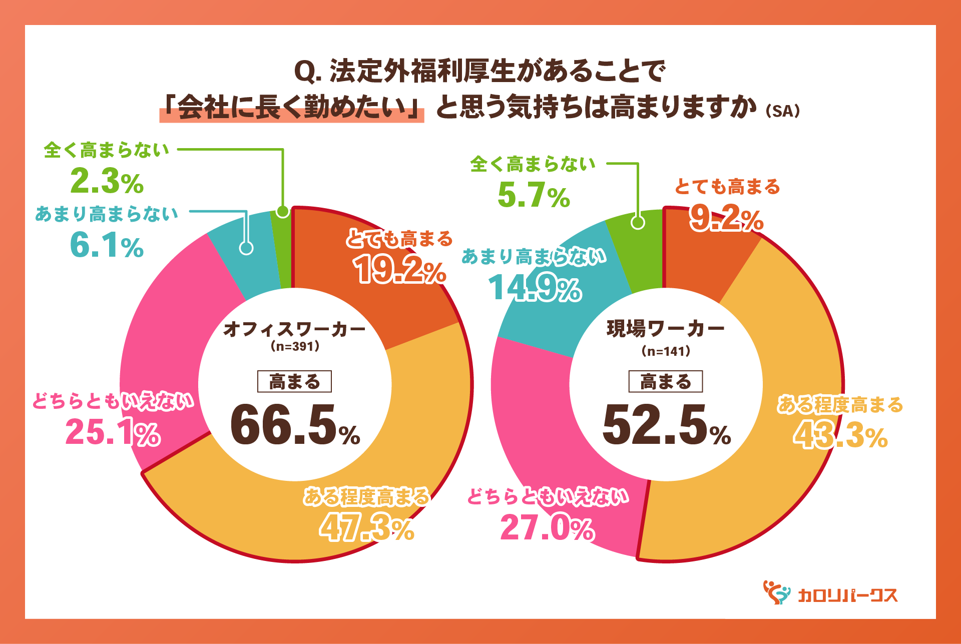 福利厚生制度について「入社の決め手になったか」と「長く勤めたいという気持ちになったか」をそれぞれたずねたところ、採用時の大きな決定要因よりも、「働き続けたい」と思える環境づくりに強く作用する存在であることがわかりました。制度があることで「勤続意欲が高まる」と回答した人は オフィスワーカーでは6割超、現場ワーカーも5割超と非常に高く、“働き始めてから感じる価値”として、福利厚生は確かな役割を果たしています。