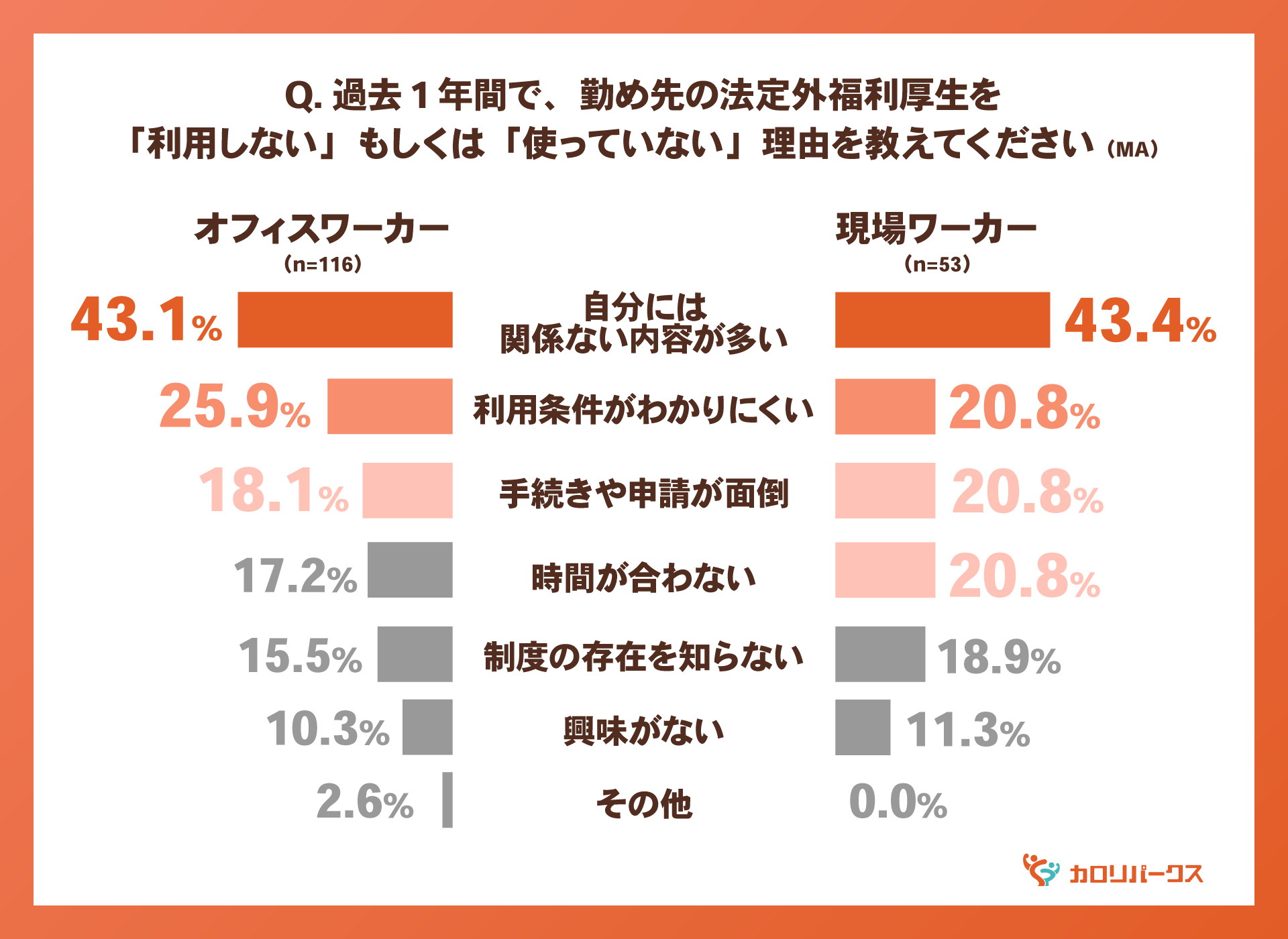 続いて、福利厚生の利用が0回だった人に理由をたずねたところ、共通して最も多かったのは「自分には関係ない内容が多い」4割超、次いで「利用条件がわかりにくい」「手続きや申請が面倒」、現場ワーカーは同率で「時間が合わない」が上位でした。