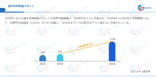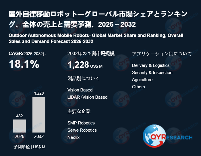 QYResearchが発表した新たな市場調査レポート「屋外自律移動ロボット―グローバル市場シェアとランキング、全体の売上と需要予測、2026~2032」によると、世界の屋外自律移動ロボット市場規模は2025年の約389百万米ドルから2026年の452百万米ドルへと順調に拡大すると見込まれ、予測期間中は年平均成長率(CAGR)18.1%で成長し、2032年には1228百万米ドルに達すると予測されている。