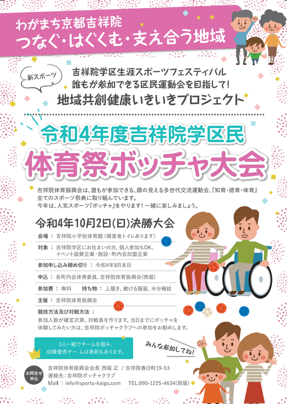 現在、研究所代表は、地域の体育振興会会長として活動しながら、同志社大学大学院に進学し、地域エンパワメント研究を実践中です。大学院の授業を一緒に受ける障害のある学生(頸椎損傷の車椅子ユーザー、視覚障害者)らに、地域インターンシップとして地域に来てもらい、住民とのボッチャ体験を重ねてきました。この度、「吉祥院学区民体育祭ボッチャ大会」開催を、スポーツを通じた地域共生社会実現の契機にします。