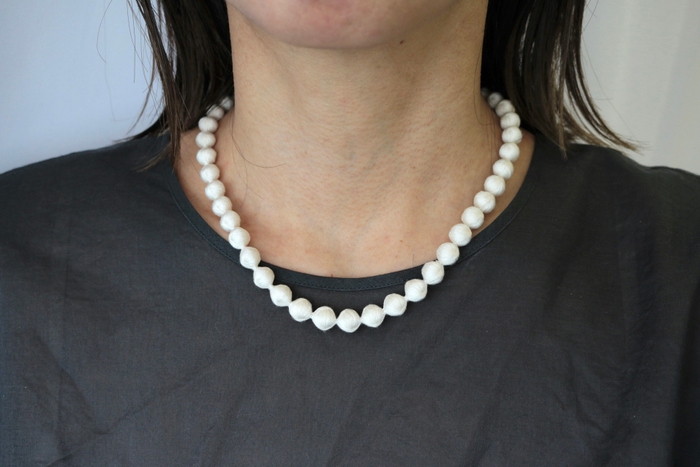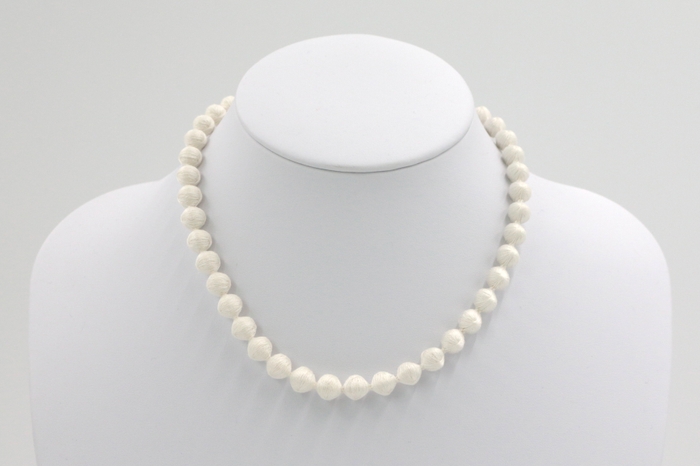 留め具までシルクの糸なので、金属アレルギーにも対応。身に着ける人へのやさしさにこだわったネックレスが誕生しました。