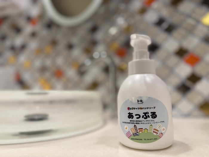 PROJECT」の一環で、浜田化学株式会社(本社:兵庫県尼崎市)と連携し、使い終わった食用油をリサイクルして作られたハンドソープ「あっぷる」を採用しました。ホテル京阪の一部店舗でも、使用した食用油の回収に協力しており、環境負荷の低減に貢献しています。