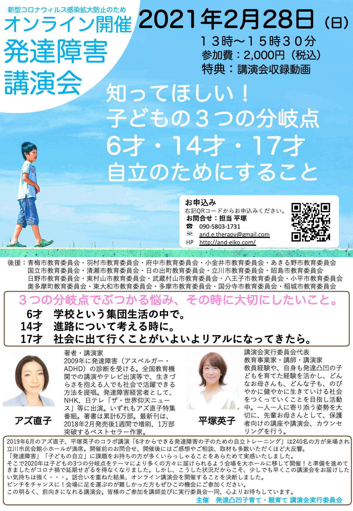 発達凸凹子育て・親育て講演会実行委員会(本部:東京都あきる野市、代表:平塚 英子)は、オンライン講演会「知ってほしい!子どもの3つの分岐点 6才・14才・17才 自立のためにすること」を2月28日(日)に開催します。