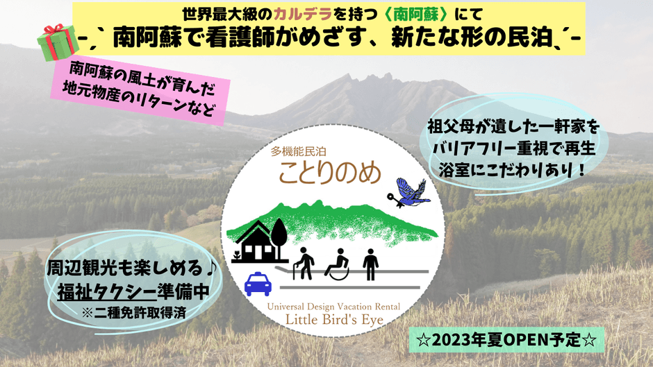 南阿蘇で看護師がめざす、新たな形の民泊 「多機能民泊 ことりのめ」 クラウドファンディングの締め切り迫る、1月31日まで実施