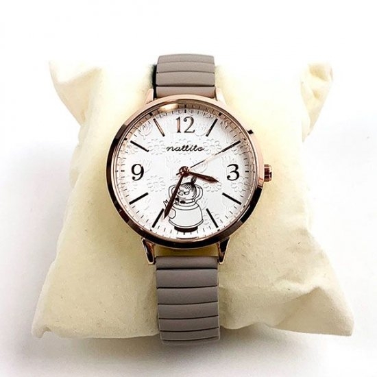 ムーミンから、リトルミィデザインのカービングジャバラウォッチのご紹介です。ラウンドフェイスの文字盤に、ベルト部分が伸縮性のあるジャバラになった腕時計です。つけ外しが簡単でデザインもとってもキュート。