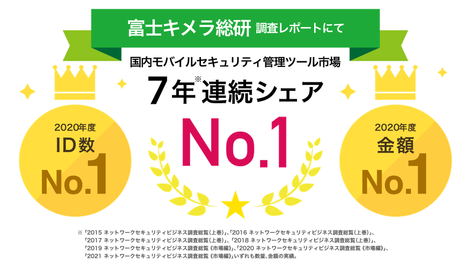 これにより、同社による過去発表の調査レポートを含め国内モバイルセキュリティ管理ツール市場で同項目のシェアが7年連続(2014~2020年度)でNo.1となりました※5。