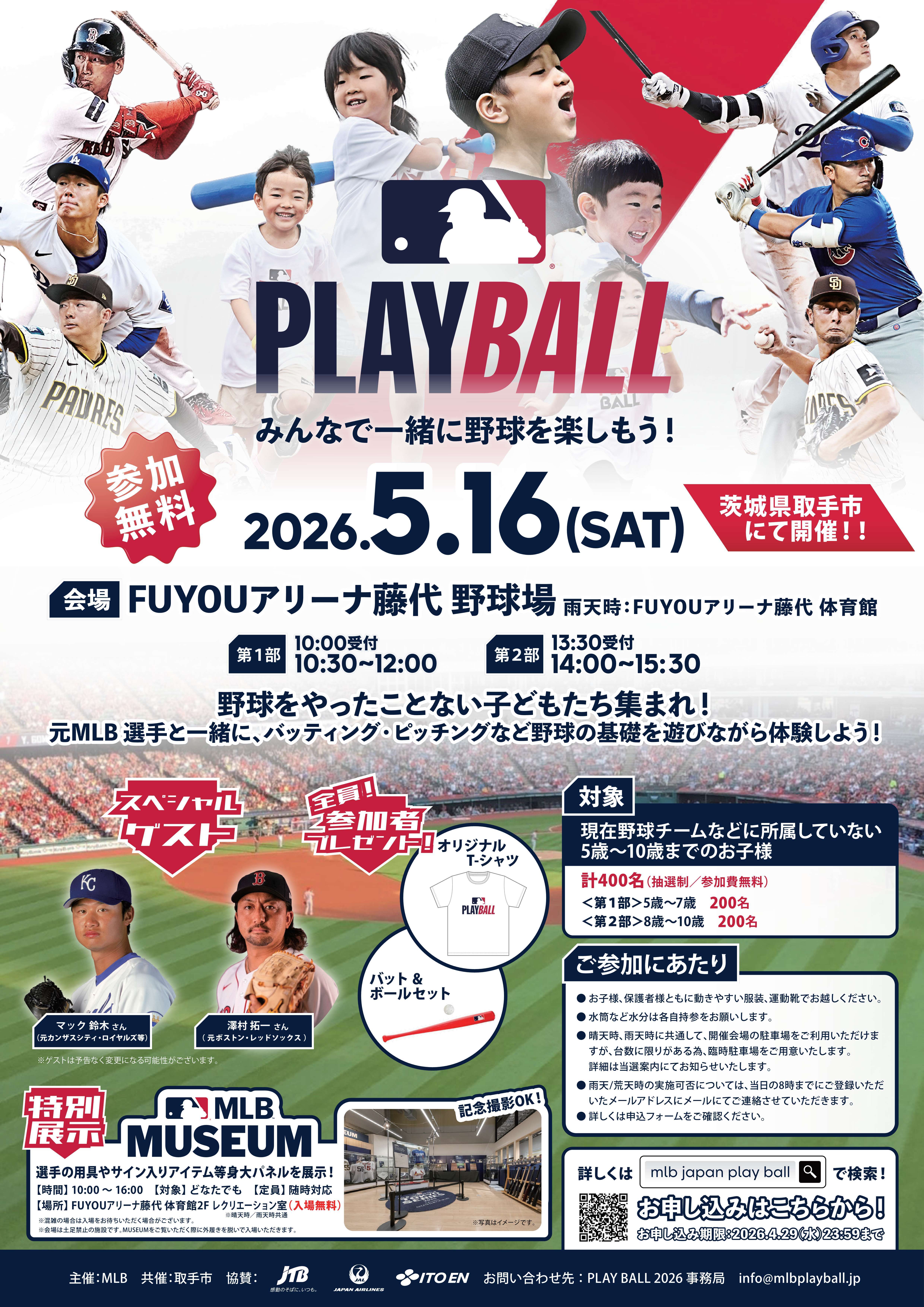 世界最高峰のプロ野球リーグ、MLB主催の子ども向け参加型イベント「PLAY BALL」を茨城県取手市で5月16日(土)に開催します。男女問わず、野球未経験もしくは野球経験の少ない子どもを対象に、野球に触れ、楽しみながら基本のプレーを体験できるイベントです。会場のFUYOUアリーナ藤代では、申込み不要の「MLBミュージアム」も同日開催します。たくさんの子どもたちの参加と、皆様のご来場をお待ちしています。