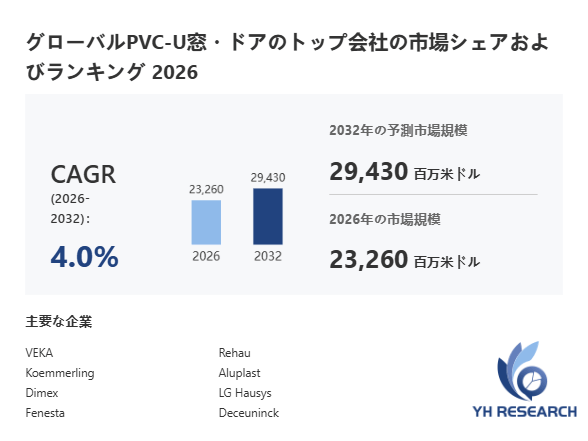 YHResearch調査チームの最新レポート「グローバルPVC-U窓・ドアのトップ会社の市場シェアおよびランキング 2026」によると、2026年の23260百万米ドルから2032年には29430百万米ドルに成長し、2026年から2032年の間にCAGRは4.0%になると予測されています。