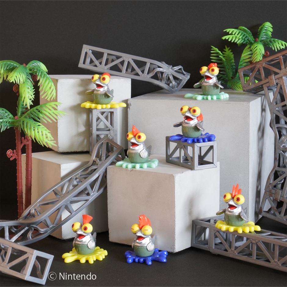 マスコットはゲーム内で選べる7種の髪型のコジャケで、ゲームの世界観を体現しているインクの台座もついていて、ちょこんと飾れます。インクの台座の色はランダムで全3色です。何が出るかはお楽しみです。