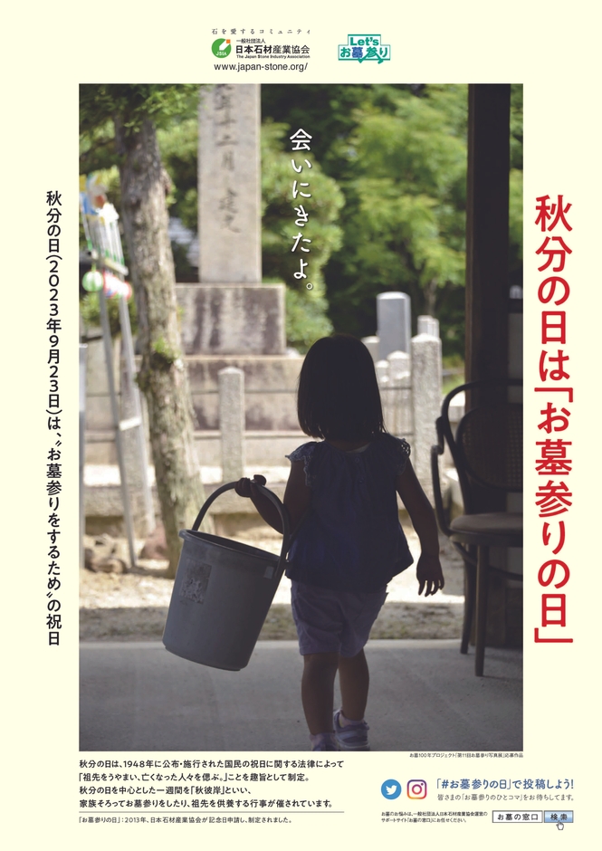 石材業界最大の全国団体である一般社団法人日本石材産業協会(以下「石産協」)は、2023年9月23日(土・祝)の「秋分の日」に向けて、石産協が制定した「秋分の日はお墓参りの日」の更なる認知度向上を図り、お墓参りの啓発策の一環として「秋分の日はお墓参りの日」のポスター約4,000枚を協会員の店頭や、お寺、学校、生花店などへ掲出し、各協会員のSNSアカウントからも情報発信を行うことで、その啓発活動を促進しています。