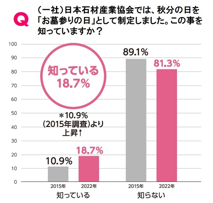 石産協が制定した「秋分の日はお墓参りの日」の認知度は18.7%(2022年)で、前回(2015年)の10.9%より7.8ポイント上昇しており、その認知度は年々高まってきています。(※)特に本年夏のお盆時期は猛暑だったこともあり、炎天下でのお墓参りを控えられた方々も一定数いらっしゃったことが想定されることから、暑さもひと段落する頃の9月に「秋分の日はお墓参りの日」があることの認知度向上施策を強化することで、お墓参りをするきっかけ作りになるものと期待しております。石産協では2023年の「秋分の日はお墓参りの日」の認知度25%を目標に今後も秋分の日のお墓参りの啓発に努めてまいります。