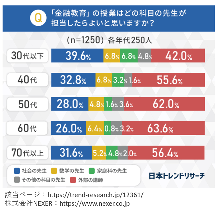 大手リサーチ会社の調査によると、「高校家庭科での「資産形成」の授業は誰が教えるべきか?」との問いに「外部講師」との解答が過半数ですが、しかしながら家庭科教諭が具体的な学習指導案を考案し授業を実施している例もあります。