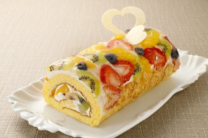 ミックスジュースクリームと4種類のフルーツをしっとりスポンジで巻き、4種類のフルーツを虹のようにちりばめた、色鮮やかなロールケーキ。