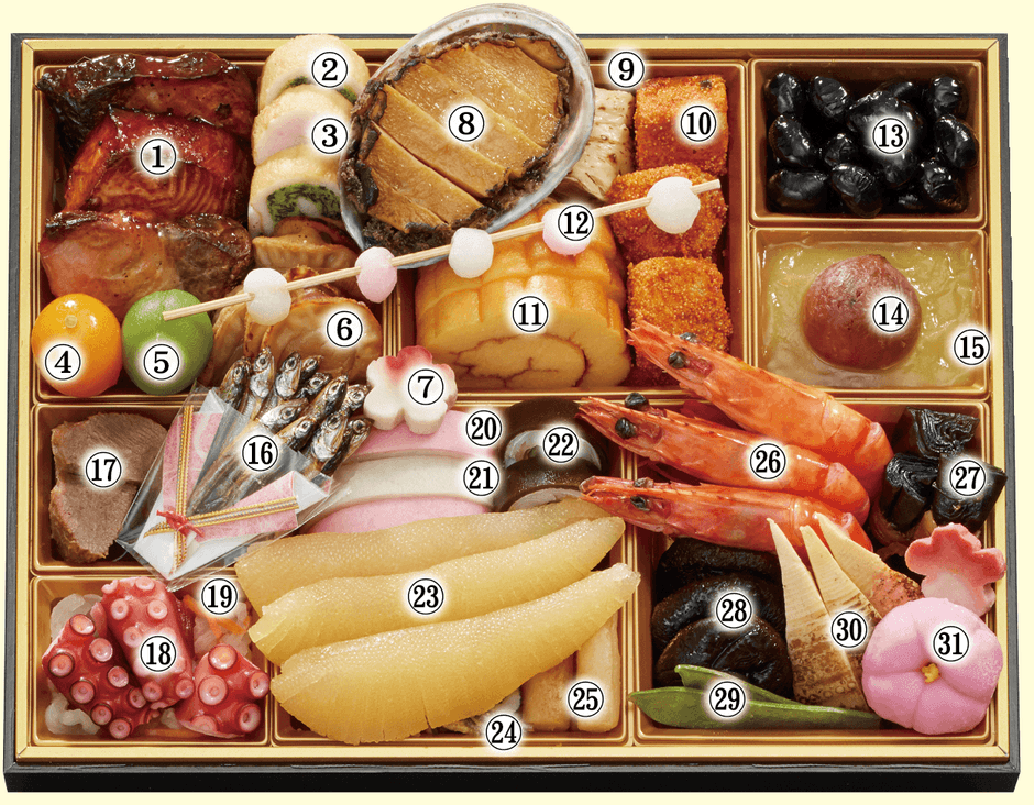 縁起物やお正月の定番メニューを中心に、和風料理を華やかに盛り込みました