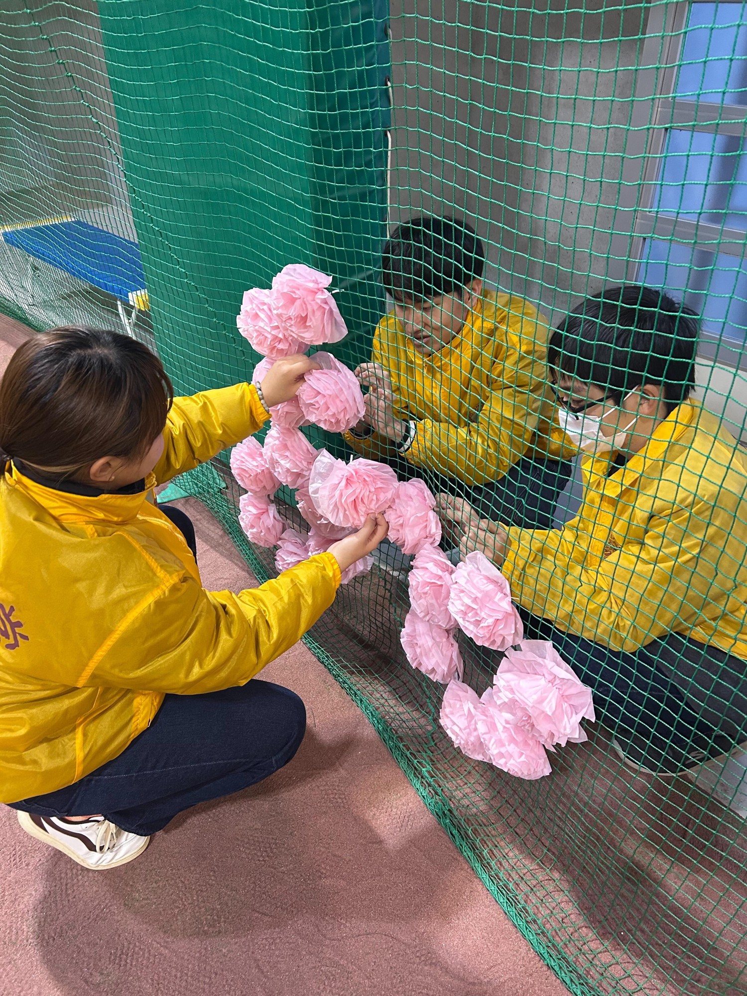 学生43人と卒業生8人の計51人は15日朝に天白キャンパスを出発し、午後に会場に到着。昨年までは室内グラウンドを使用したコースでしたが、今回は屋外の駐車場に移し、コースの全長も140mから3・4歳は200m、5歳以上は240mに伸びたことから、学生たちは夜遅くまでコースや表彰台の設営などの準備を念入りに行いました。