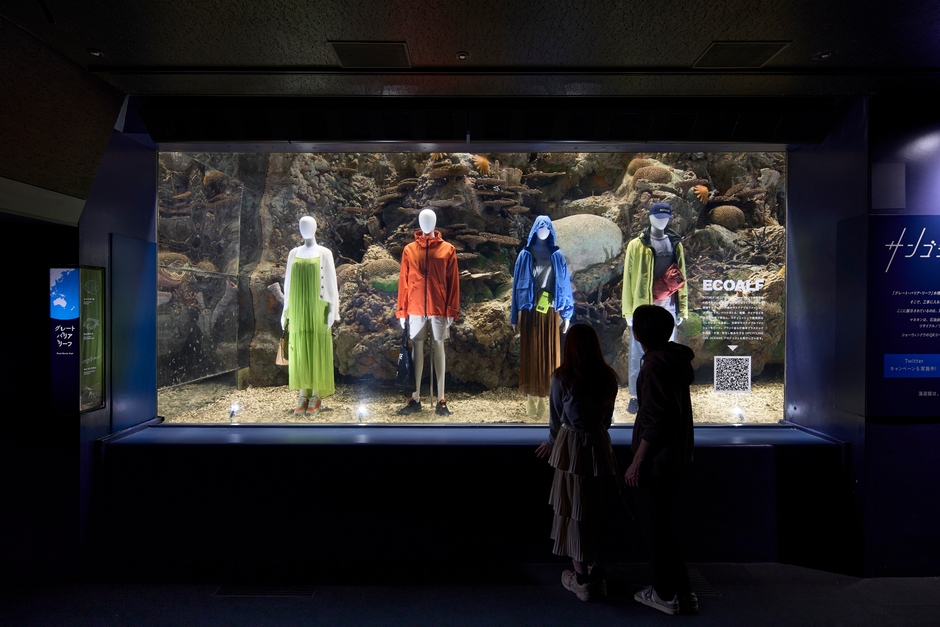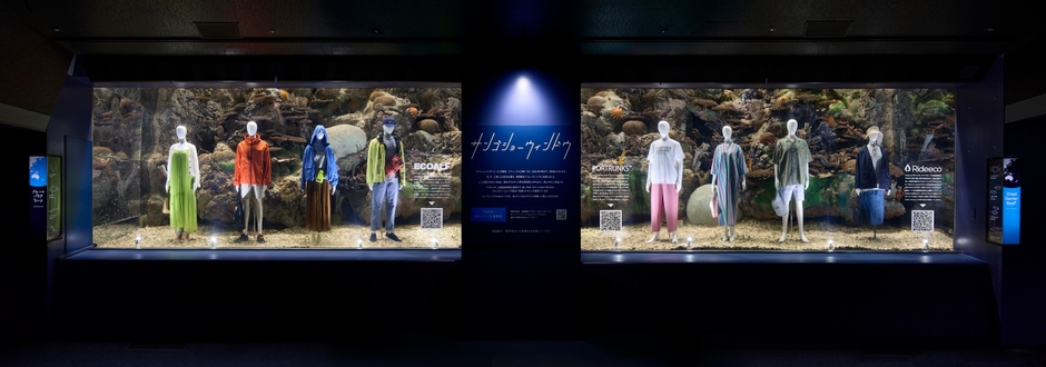 72種約800点の魚を移動させ、約450トンの海水を全て抜いた展示水槽のサンゴ礁(擬サンゴ)を背景に、海洋プラスチックごみや漁網などの素材をリサイクルして作られた、海にやさしいファッションアイテム30点を身に着けた紙製マネキン8体を、ショーウィンドウ風に展示しました。
