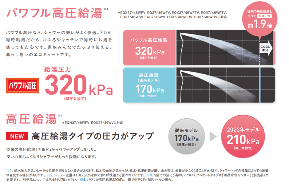 ・ 標準圧機の給湯圧力を170kPaから210kPaに高め、シャワーの体感圧力を従来比の約110%※9に向上。高圧機、標準圧機ともに業界最高※1の給湯圧力を実現。