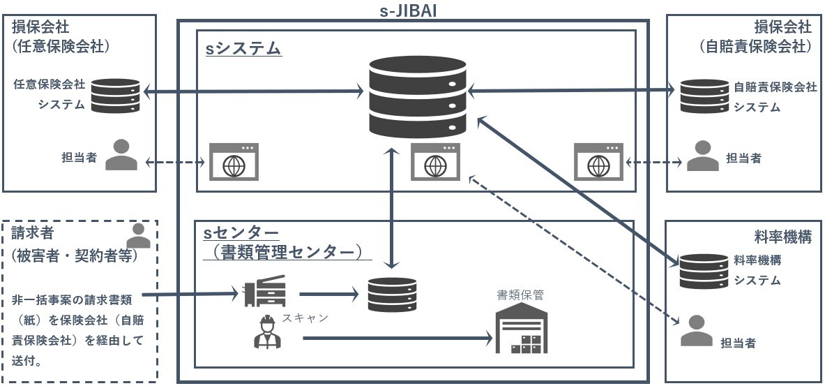 「s-JIBAI」は、事案生成や精算請求などの各種申請など事案処理を行う「sシステム」と、書類の電子化や保管等行うBPOセンターの「sセンター(書類管理センター)」で構成されています。