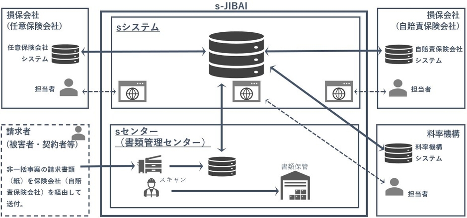 「s-JIBAI」とは、保険会社および料率機構の間で発生する請求関係書類の郵送をペーパーレスで実現するサービス(2)です。