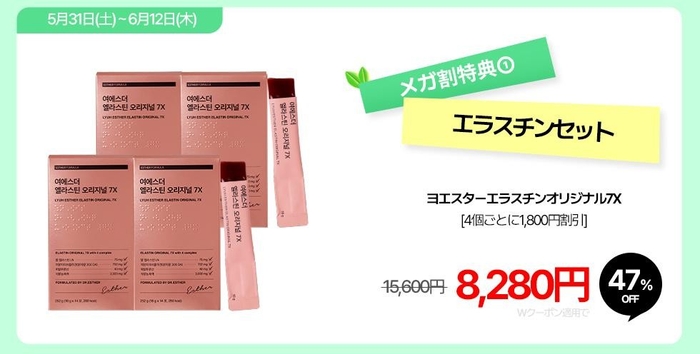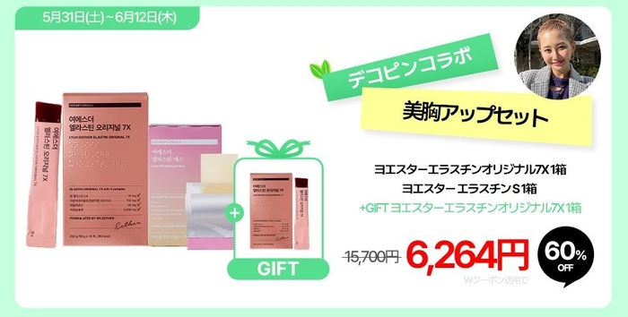 今回のQoo10メガ割では、バストケアに欠かせないエラスチンセットを販売いたします。エラスチンとコラーゲンをお美味しく手軽に摂取できる本セットをお買い上げいただいたお客様全員に「ヨエスターエラスチンオリジナル7X 1箱」をプレゼントいたします。